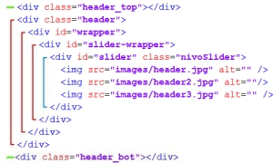Finally, you see center section having id="slider" and class="nivoSlider", combining by that fact javascript and css in the same line. With id="slider", Javascript define an hidden area used for image swapping effects. Class nivoSlider define physical layout of this area.