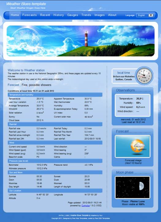 Weather Blues v2 template is a serie of files you have to edit and send to your website. This template requires that you already have Cumulus software (v1.9.2 or newer) installed on your Pc. You will also need a Domain or a personnel web space on a web-server where to publish your site. Finally, you need a ftp access to your site